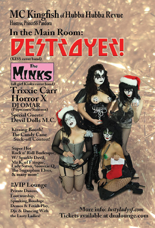 Burlesque by: Bitter Waitress, Delilah and Lady Satan DJ- Ruby White spins bubble gum, garage rock, girl groups and more (Panty Raid, Sugar Shack SF) The Menu- GinO is famous for her delicious dishes and for Go Deep! She promises to make them messy. shows are not for the faint of heart or weak of humor.